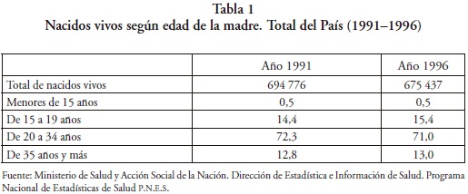 La Tabla 1 no sólo muestra el robustecimiento de la tendencia anterior, sino que sugiere nuevamente un patrón de cambio polarizado. Si tenemos en cuenta que se trata de un período de tan sólo cinco años, las diferencias distinguidas resultan dramáticas. En primer lugar, la proporción de nacidos vivos de madres en su plena edad reproductiva (20 a 34 años) descendió de manera significativa, mientras que entre las madres de mayor edad (más de 34 años) se incrementó levemente. Estas dos observaciones resultan consistentes con una postergación de la maternidad y/o una disminución de la fecundidad. En segundo lugar, el incremento de nacimientos de madres adolescentes es particularmente relevante, más aún considerando la tendencia en los otros grupos de edad. Mientras que el 14,4% de los niños y niñas nacidos en 1991 tenía madres adolescentes, apenas un lustro después este porcentaje crecía a 15,4%.