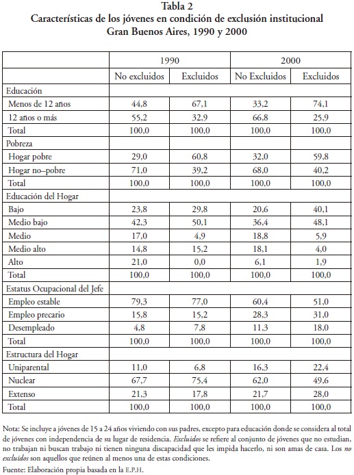 Entre 1990 y el año 2000 la proporción de jóvenes con exclusión institucional7 en el Gran Buenos Aires disminuyó de 4,9 % a 2,9 %. Se trata de más de 63 000 jóvenes de 15 a 24 años de edad que, aun en tiempos de creciente pobreza y desempleo, no son estudiantes, no están empleados ni buscando trabajo, no son amas de casa, ni tienen discapacidad alguna que les pudiera impedir realizar una de estas actividades. Pero así como la proporción de jóvenes excluidos disminuyó, al mismo tiempo este grupo presenta hoy mayores desventajas que el resto de la población juvenil. Es decir, ahora son menos, pero con una mayor acumulación de desventajas. La Tabla 2 resume algunas de estas desventajas.