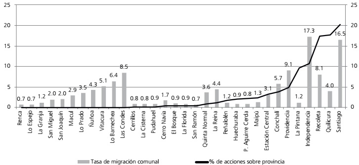 Gráfico 2 Proporción de acciones de municipios y tasa de migración comunal (%)