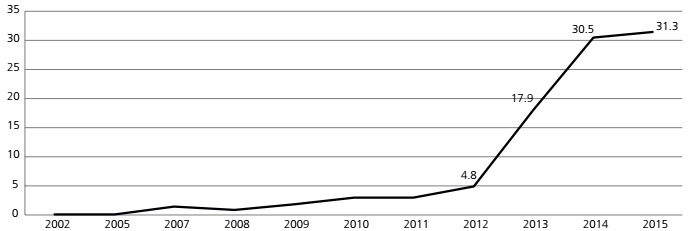 Uno de los indicadores que puede vincularse a la débil proyección temporal de las acciones se expresa en la escasa información con que cuentan los propios municipios respecto de inciativas ejecutadas en el pasado reciente: el 84.5% de las acciones de las que se tiene registro se concentra entre 2012 y octubre de 2015 (Gráfico 3). No existe registro escrito, gráfico u oral de acciones anteriores a 2002, y es prácticamente inexistente para antes de 2012. Este dato permite formular la hipótesis del retraso en la reacción de los municipios frente a la relidad migratoria. La falta de información sobre el pasado reciente supone también una baja o nula ejecución de acciones. Si consideramos que el actual proceso migratorio que vive la provincia de Santiago se inició a mediados de los noventa, y que el primer programa municipal de migrantes se creó en 2009 en La Pintana, mientras que la primera oficina se fundó en Quilicura en 2010, es decir, entre doce y quince años después de iniciado el flujo, el retraso en la reacción municipal resulta evidente.