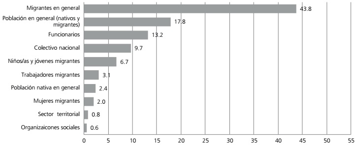 En cuanto a los sujetos de las acciones predominan las destinadas a los “migrantes en general” (43.8%), seguidas a cierta distancia por las dirigidas a la “población en general”, migrante y no migrante (17.8%), y luego las que se orientan a funcionarios (13.2%), seguidas por las dirigidas a algún colectivo nacional específico (9.7%). En contraposición, el trabajo orientado a las mujeres migrantes es prácticamente inexistente (2.0%), y muy bajo en relación a niños y jóvenes (6.7%), lo mismo que a trabajadores migrantes (3.1%). También concitan bajo interés las acciones orientadas de manera exclusiva a la población nativa (2.4%) (Gráfico 5). Se deduce así que los municipios tienen una aproximación general a la cuestión migratoria, y solo marginalmente realizan distinciones o focalizaciones hacia grupos específicos, como niños o mujeres. Surge la pregunta de si esto es consecuencia de una estrategia o de una práctica que asume a los migrantes como un colectivo homogéneo. También se observa que la población nativa prácticamente no es parte exclusiva de los objetivos de las acciones. Por último, el trabajo con funcionarios de los municipios despierta cierto interés pero lejos del deseable toda vez que parte importante de los derechos sociales ligados a la acción de los gobiernos locales dependen en última instancia de la disposición de los funcionarios o la información de que estos dispongan.