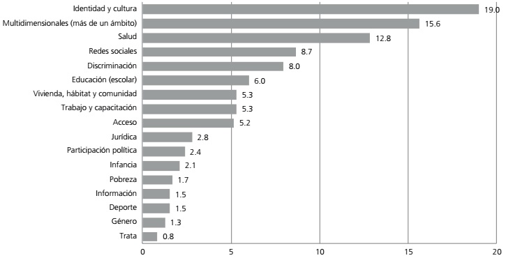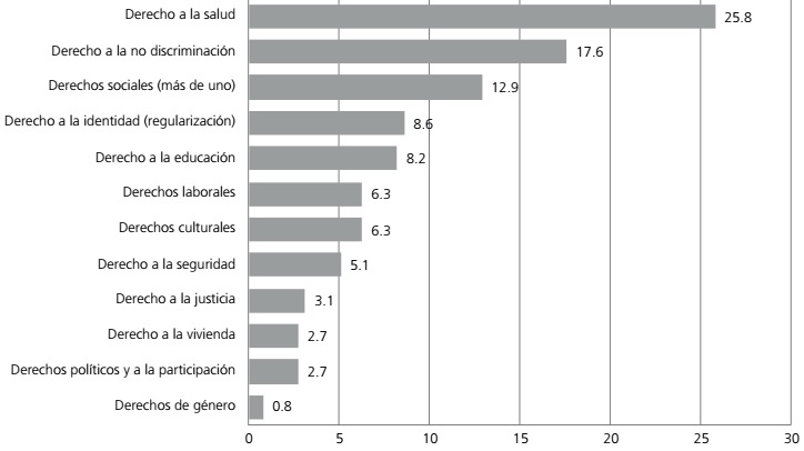 Destaca también la preocupación por el derecho a la no discriminación (17.6%), y las acciones orientadas a la regularización, que inciden sobre prácticamente todos los derechos cívicos, sociales y políticos, pero que principalmente producen el derecho a la identidad. Resaltan por su poca presencia los derechos de género, los políticos y los culturales, que agrupan respectivamente al 0.8, 2.7 y 6.3% de las acciones que se orientan a los derechos (esto es, el 35.7% del total de las acciones). Cabe subrayar la baja presencia de los derechos culturales, considerando que del total de acciones la mayoría se inscribe en la dimensión de la identidad y la cultura.
