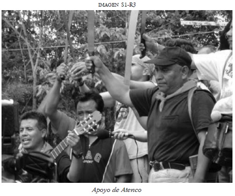 Otro ejemplo serían las imágenes S1-R3 y S1-R4. La primera enfoca a uno de los dirigentes de San Salvador Atenco y es claro que los machetes, que simbolizan la lucha atenquense, son parte central de la escena, mientras que la segunda capta de perfil/espalda al mismo dirigente y también aparecen los machetes y la guitarra que en la anterior tocaba un atenquense. Sin embargo, el título editado omite la referencia a Atenco que se encuentra en el nombre del archivo (atenco_público.jpg) y en la nota al pie lo que se resalta es una hermandad que unía a todo el público asistente y que la imagen por sí misma difícilmente podría mostrar.