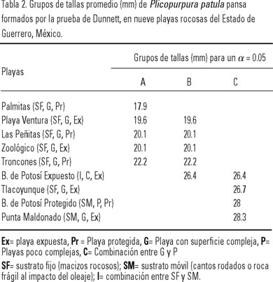 Las tallas promedio de los caracoles entre las playas rocosas presentaron diferencias significativas (F = 37.7, P < 0.05), y no se encontró homogeneidad de varianzas (Levene's = 15.325, P < 0.05). La comparación múltiple de medias de Dunnett, arrojó tres grupos con tallas promedio similares (tabla 2):