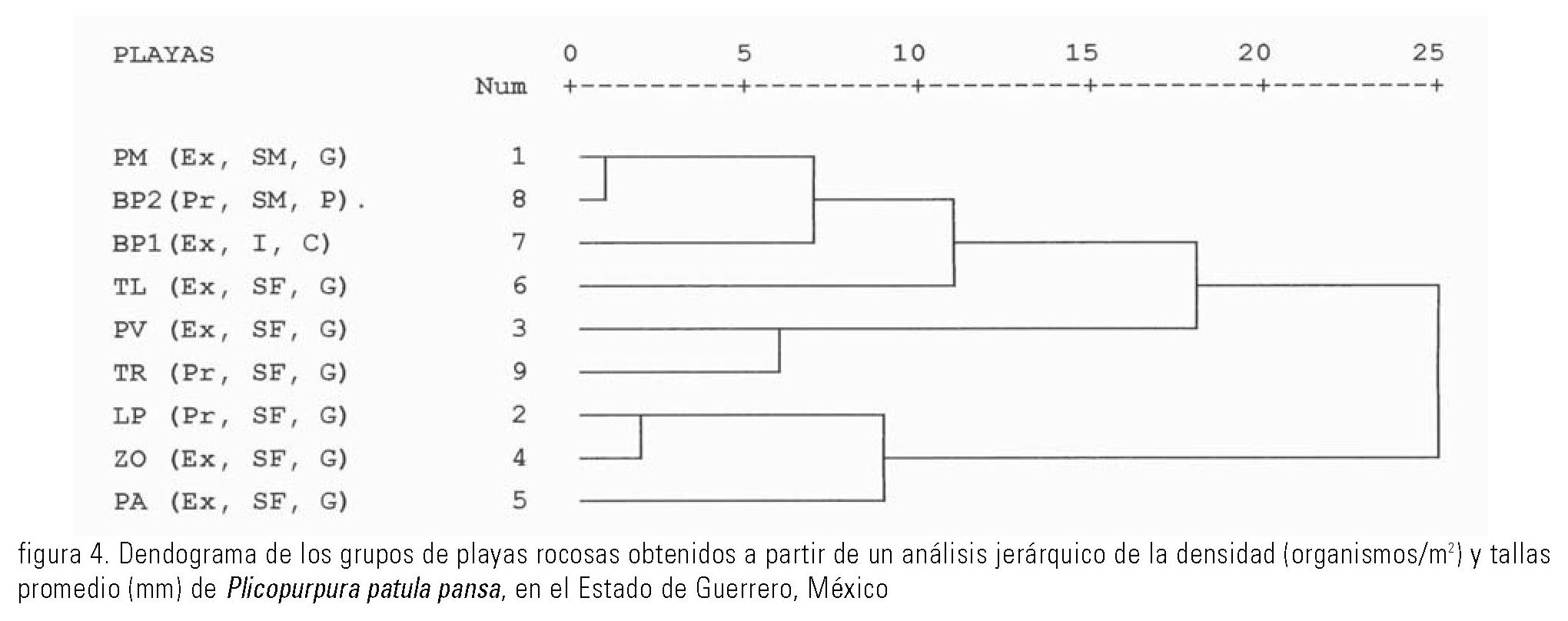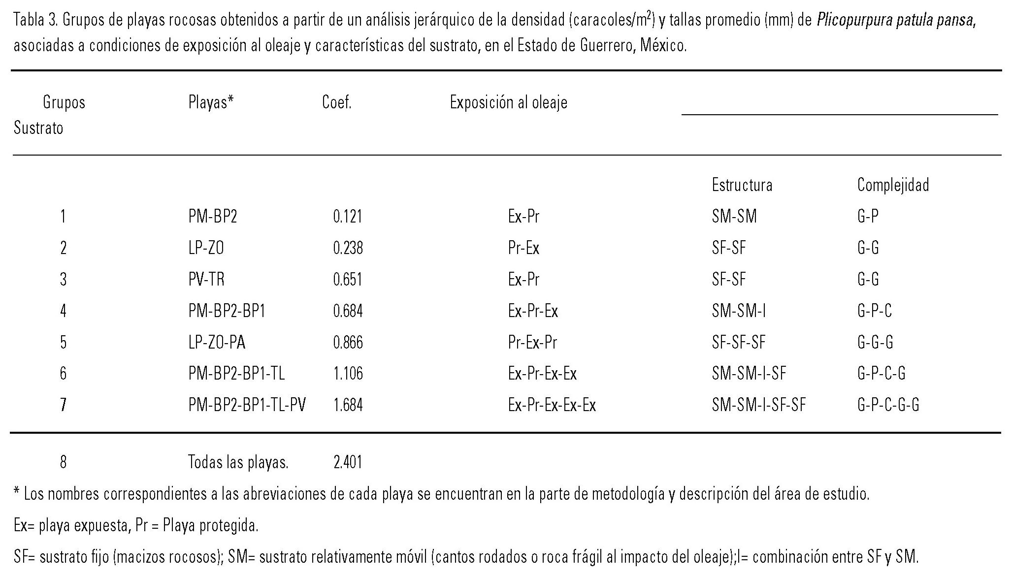 El análisis jerárquico, mostró que las playas que presentaron la mayor similitud en densidades y tallas promedio, fueron aquellas que integraron los grupos 1, 2 y 3. Dentro de cada uno de estos grupos, las playas tuvieron en común características más asociadas con el sustrato, como la firmeza y complejidad, que con la exposición al oleaje, ya que en cada grupo se presentó una playa expuesta y una protegida. La misma situación se observó en los grupos 4 y 5, que mantuvieron la misma tendencia en lo que respecta al sustrato.