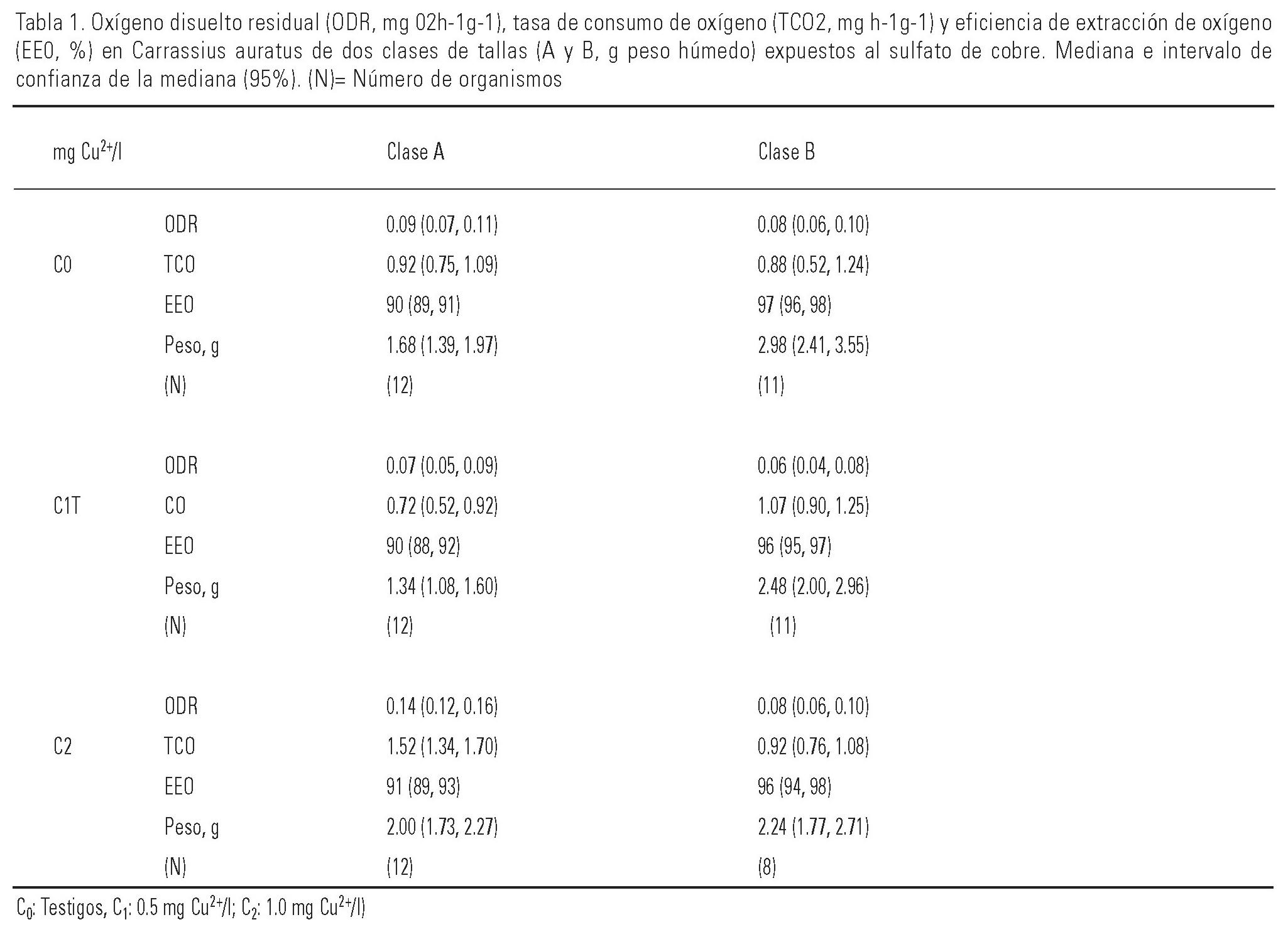 En la Tabla 1 se presentan los resultados obtenidos de los juveniles de C. auratus de la Clase A (1.67 ± 0.12 g) y de la Clase B (2.57 ± 0.18 g). Se muestran los valores medianos e intervalos de confianza de la mediana, correspondientes al oxígeno disuelto residual (ODR, mg O2 h-1 g-1), a la tasa de consumo de oxígeno (TCO, mg O2 h-1 g-1) y a la eficiencia de extracción de oxígeno (EEO, %) del grupo testigo y de los grupos experimentales.