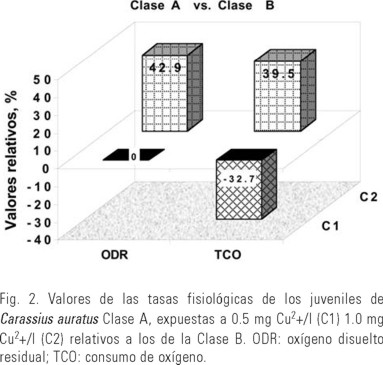 En los juveniles de la carpa dorada C. auratus se comprobó a través del ODR, que los baños de 30 min de duración en sulfato de cobre (1.0 mg Cu2+/l) provocaban estrés en los peces pequeños, en cambio en los de mayor tamaño no se detectaron los efectos adversos del metal, aparentemente. Estos resultados coinciden con Heath (1990), quien menciona que los peces pequeños son más afectados por el cobre debido a que lo acumulan más rápidamente que los grandes; el autor refiere que esto se debe a que la tasa de captación del metal, a través de la branquia, se relaciona con la tasa metabólica peso-específica. Heath (1987) también indica que la magnitud del oxígeno residual es proporcional a la concentración del tóxico a la que se exponen los peces, lo que no se pudo comprobar en la carpa dorada ya que sólo la mayor concentración de cobre produjo estrés en las carpas pequeñas y no tuvo efecto en las de mayor tamaño, como se estableció anteriormente (Vázquez, 2003).