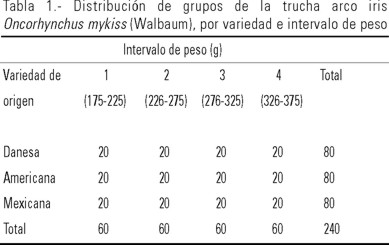 La toma de muestras se realizó en granjas de producción de trucha arco iris localizadas en la Región Noroeste del Estado de Chihuahua, la cual se caracteriza por ser una zona en donde las fuentes de agua para la producción de trucha garantizan temperaturas bajas durante todo el año (10 a 20 0C), se emplearon un total de 240 truchas de las variedades danés, americano y mexicano clasificadas según al peso en cuatro grupos (175-225 g (I1), 226-275 g (I2), 276-325 g (I3) y 326-375 g (I4)), de acuerdo a como se presentan en la Tabla 1. Los análisis se efectuaron en el Laboratorio de Calidad de la Canal y de la Carne de la Facultad de Zootecnia de la Universidad Autónoma de Chihuahua.