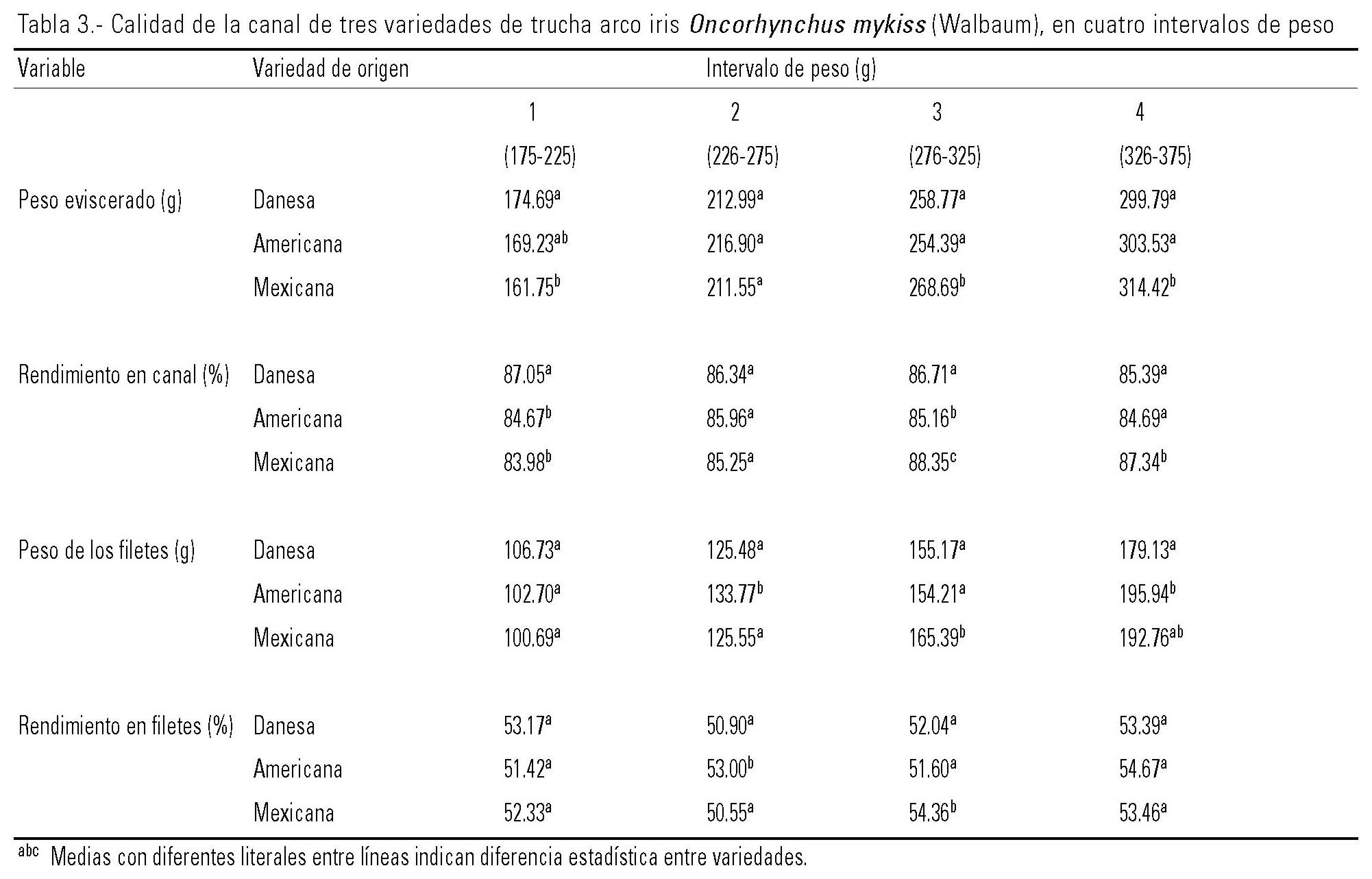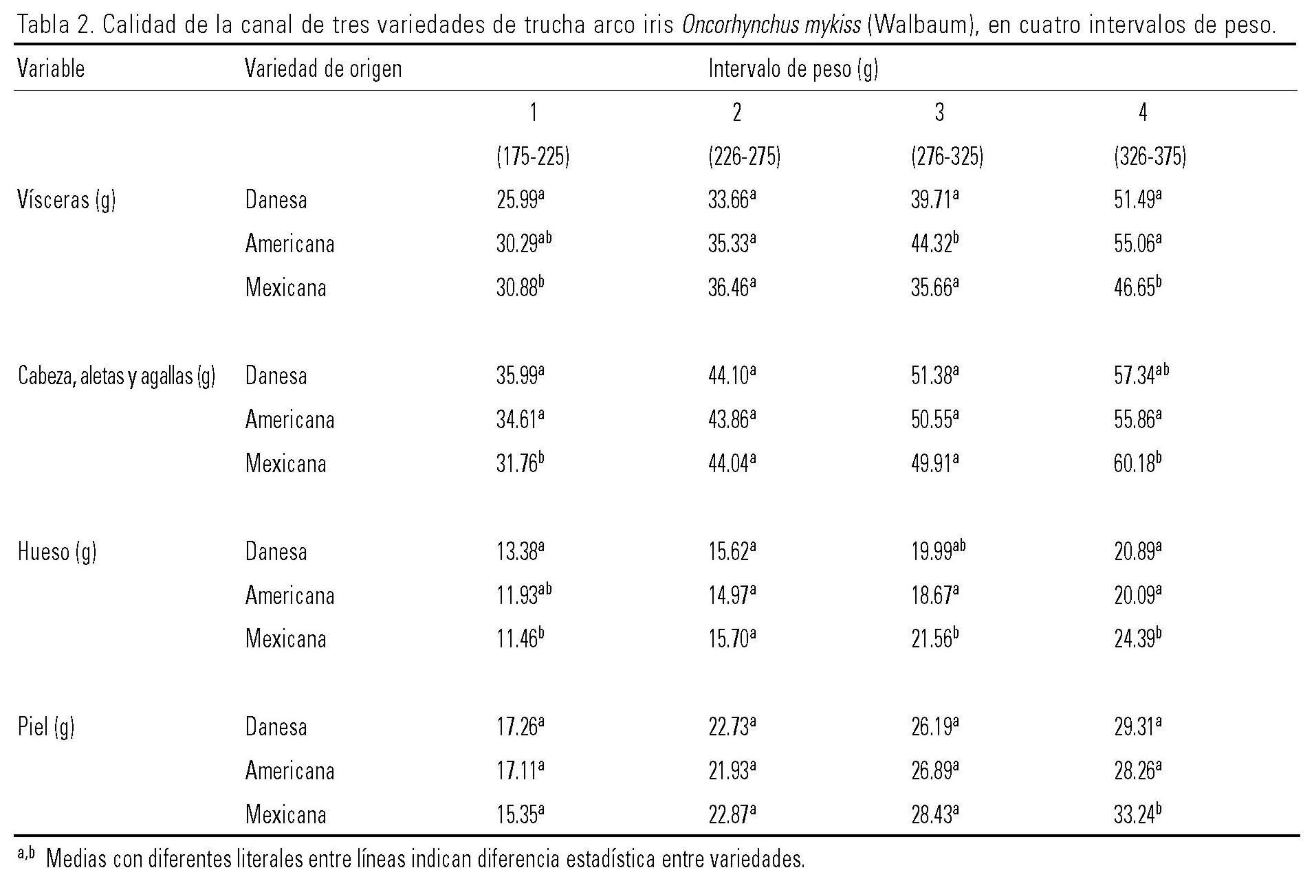 Calidad de la Canal.- Como era de esperarse con el incremento en el peso al sacrificio, aumento en el peso de las variables de vísceras, cabeza, aletas, agallas y piel (Tabla 2), existió al mismo tiempo diferencias entre las variedades y los intervalos de peso (P<0.05). La trucha mexicana presenta un desarrollo más pronunciado de cabeza, aletas, agallas, piel y hueso en comparación con las variedades danés y americano, ya que de tener los valores más bajos en los primeros dos intervalos de peso, en los intervalos 3 y 4 el valor de estas variables se incrementa, esta tendencia se invierte para el caso de las vísceras, en donde el valor más bajo del I4 es para la mexicana.