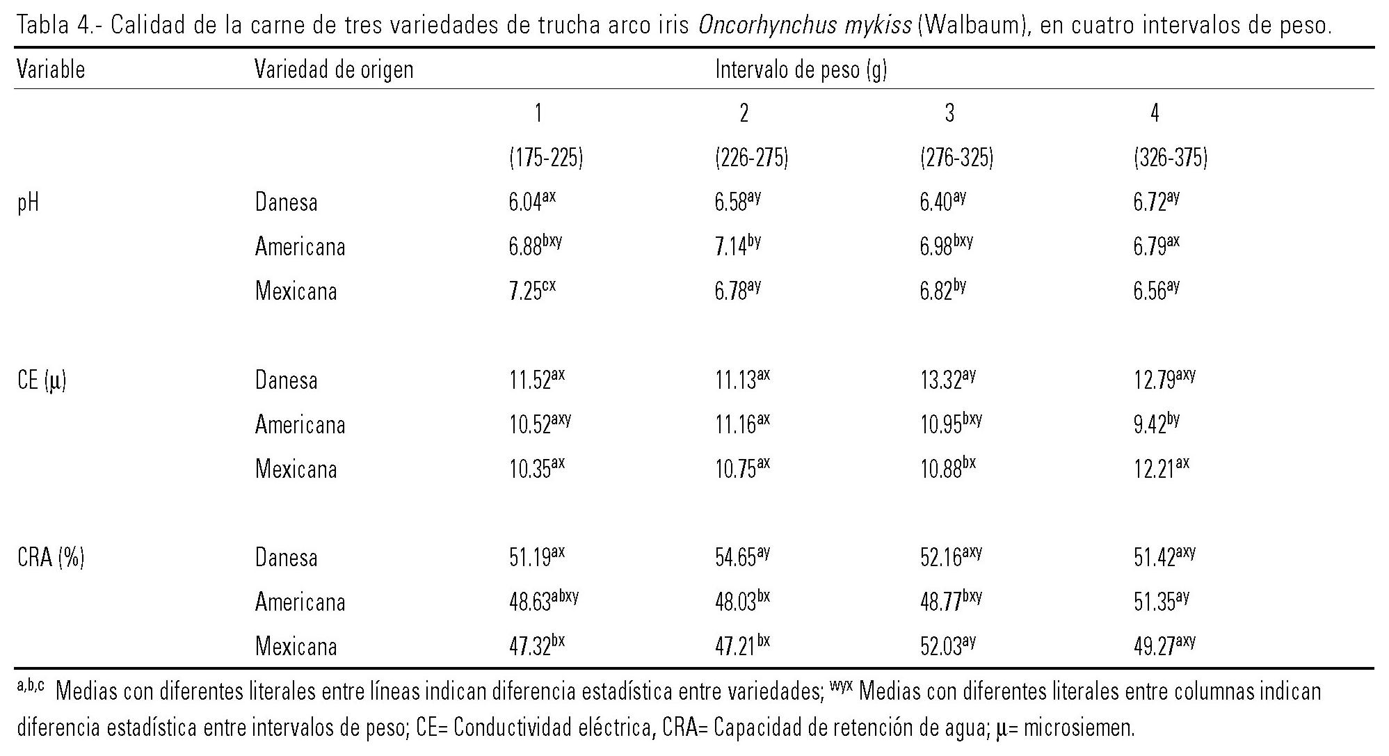 Calidad de la Carne.- En la Tabla 4 se muestran los valores de calidad de la carne de pH, CRA y CE, los cuales presentaron interacción significativa de intervalo de peso y variedad (P<0.05). En el caso del pH existió diferencia significativa por variedad de origen en los intervalos del 1 al 3, siendo claro que las truchas danesas se encontraron siempre más cercanas a la acidez, mientras que las americanas y la mexicana se acercaron más a la neutralidad. Por otra parte existió efecto significativo por intervalo de peso en las tres variedades de truchas para el pH, ya que en el caso de la danesa estos valores aumentan a medida que se incrementa el peso, no así en la mexicana y americana.