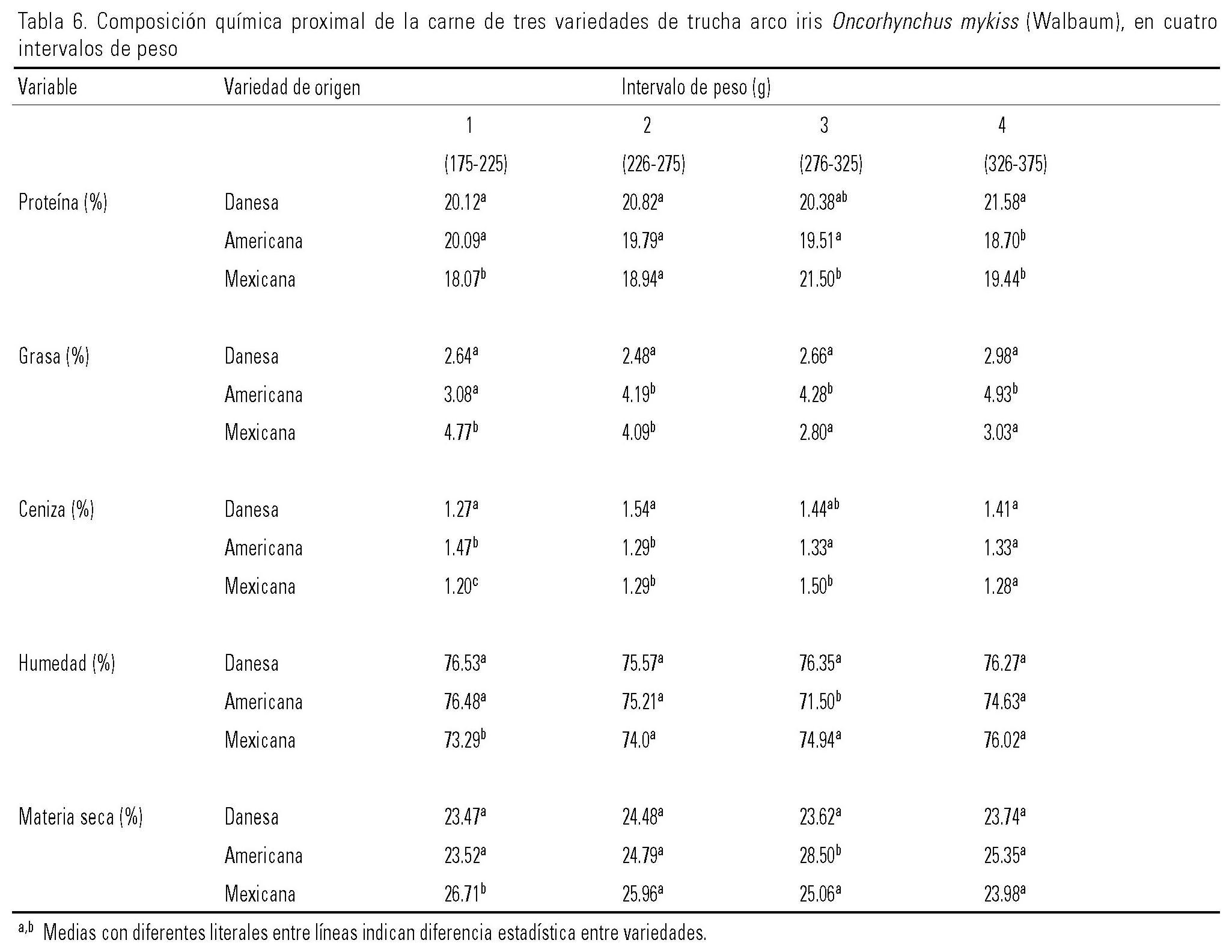 Los resultados del análisis proximal se presentan en la Tabla 6, se observa que existió diferencia significativa (P<0.05) para la PC en los intervalos 1, 3 y 4, al mismo tiempo la variedad de trucha danés presento los valores más elevados de PC en todos los intervalos de peso, exceptuando el I3.