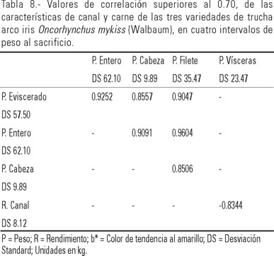 En la Tabla 8 se presentan los valores de las variables que obtuvieron una correlación, superior a 0.70, ya que estas son las consideradas como más importantes dentro del estudio. De estas solo destaca el peso del filete.