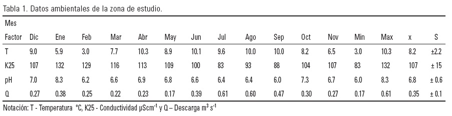 En relación a los datos ambientales, la temperatura (T) a lo largo del año tuvo un promedio anual de 8.2 ºC, presentando su mínimo de 3 ºC en febrero y su máximo de 10.3 ºC en abril (Tabla 1, Fig. 7); la conductividad (K25, conductancia estandarizada en 25 ºC) promedio fue de 107 µS cm-1, con una mínima de 83 µS cm-1 en julio y un máximo de 132 µS cm-1 en enero; el pH mostró un promedio de 6.8 con una mínima de 6 en septiembre y un máximo de 8.3 en enero y finalmente la descarga (Q) presentó en promedio 0.35 m3 s-1, con una mínima de 0.17 m3 s-1 en mayo y un máximo de 0.61 m3 s-1 en julio (Tabla 1).