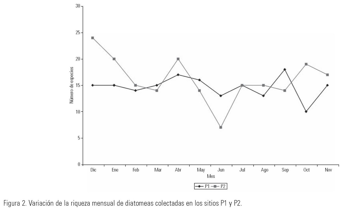 La riqueza total para el punto de recolecta uno (P1) fue de 24 especies mientras que para el punto de recolecta dos (P2) fue de 31 especies (Tabla 4). La variación mensual de la riqueza en P1 (en 10 meses, fue de 16 especies) es menor que la variación mensual de la riqueza en P2 (en 6 meses, fue de 15 especies), con una fluctuación mensual mayor en P2 (Fig. 2). Las especies registradas en los mismos meses presentaron abundancias diferentes entre los dos puntos de recolecta (Fig. 3 y Fig. 4). Las diatomeas más abundantes y frecuentes en las dos comunidades fueron Achnanthes lanceolata, Cocconeis placentula, Navicula cryptocephala y Cymbella silesiaca (Tabla 4).