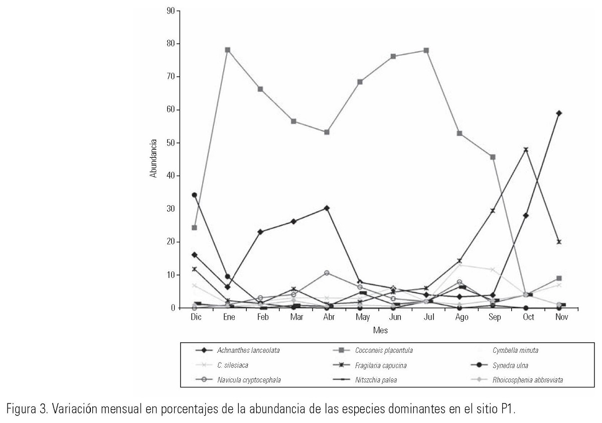 En este estudio se observó que la asociación de Achnanthes lanceolata y Cocconeis placentula se presentó en ambos puntos de recolecta, pero en P1 ambas especies presentaron un comportamiento similar a lo largo del año, lo cual corrobora lo registrado por McIntire (1964), mientras que en P2 estas mismas especies presentaron un comportamiento diferencial, pues Cocconeis placentula estuvo presente durante todo el año, y tuvo en ambos microambientes la mayor abundancia promedio con respecto a las otras especies en la época de lluvia, lo que sugiere que su distribución no está restringida al patrón de velocidad (Soininen, 2004). No obstante, en el presente estudio esta especie se vio favorecida con las condiciones microambientales de P2, al igual que Achnanthes lanceolata (Fig. 6).