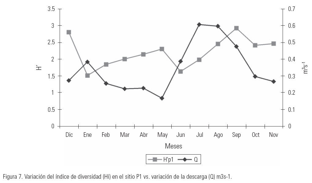 Se observó que la diversidad (H') tiene una respuesta diferencial con respecto a algunos factores ambientales, aunque estadísticamente esta relación no fue significativa, en este trabajo se observó una relación negativa entre descarga (Q) y diversidad (Hí) para P1 (Fig. 7), mientras que para P2 la temperatura tuvo una relación positiva con diversidad (H') (Fig. 8).
