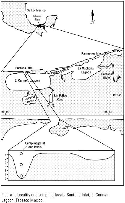 Sampling site. The CarmenPajonalMachona lagoon system was chosen as it is the most important estuarine system in the state of Tabasco, in the southern Gulf of Mexico (18°14'18°25' N, 93°34'93°54' W). This lagoon complex receives freshwater from the San Felipe and Santana rivers. It has two inlets, the "Panteones inlet" that is an artificial inlet in the Machona lagoon to the east, and the Santana inlet to the west of the system (GutiérrezEstrada & GalavizSolís, 1983). The latter, chosen as the sampling site, has a width of 170 m (VázquezGutiérrez, 1994) and a 7 m deep channel at its westernmost third section (Fig. 1).
