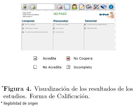 Los resultados de cada hito (en la aplicación de la prueba) podrán ser: Acredita, No acredita, No coopera, Incompleto (mediante representación gráfica) y los hitos estarán distribuidos en las tres áreas básicas del neurodesarrollo que explora el test: Lenguaje, Psicomotor y Sensorial (Figura 4).