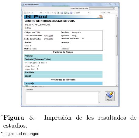 Toda la información referente a un estudio podrá ser impresa y el especialista tendrá la facilidad de agregar los comentarios que considere necesarios. En todos los casos, la impresión del encabezado de la hoja contendrá los datos que identifican al centro que avala el estudio y solo podrán ser redefinidos por el Administrador (Figura 5).