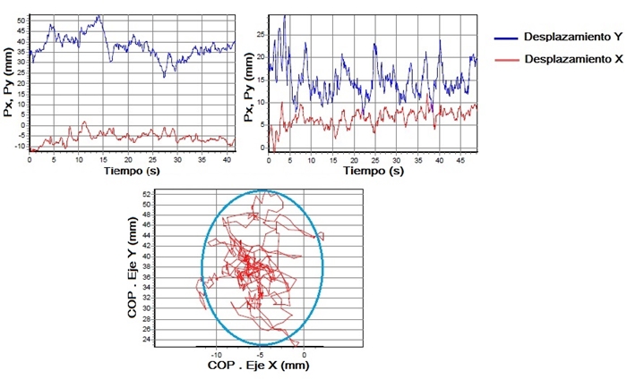 El promedio de desplazamiento del CP tanto en los ejes X como Y en el grupo estudiado, se resume en la Tabla 2. No fue considerado el desplazamiento sobre el eje Z (vertical), debido a que no se encontró una variación considerable (menores a 5 %), a pesar de variaciones forzadas.