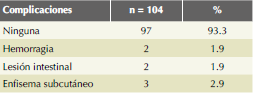 Las complicaciones relacionadas con el procedimiento quirúrgico se señalan en el Cuadro 1. La dos lesiones intestinales de esta serie fueron laceraciones advertidas de la serosa del intestino delgado y recto, ambas en pacientes con síndrome adherencial por endometriosis. Por las características de las lesiones se decidió la conducta expectante y administración de antibióticos, con una respuesta favorable en ambas pacientes. Dos pacientes tuvieron un evento hemorrágico; en la primera secundario a un cuerpo lúteo hemorrágico, con sangrado quirúrgico de 450 mL, que incluyó el hemoperitoneo. En la segunda, la causa fue un evento hemorrágico posquirúrgico, que sucedió en una paciente con un procedimiento técnicamente difícil por endometriomas bilaterales. El sangrado fue del lecho quirúrgico y se sospechó por la disminución en la cantidad de hemoglobina posquirúrgica de 14 a 9 g/dL, junto con líquido libre en un ultrasonido endovaginal. Se programó un nuevo procedimiento laparoscópico, con hemoperitoneo de 550 cc. No se requirió transfusión y la paciente se dio de alta del hospital al tercer día en adecuado estado de salud. No se registraron lesiones ureterales, vasculares, perforaciones uterinas, lesiones vesicales, daño a algún nervio, fiebre o trombosis venosa profunda y todos los procedimientos se completaron por cirugía de mínima invasión. La media de hospitalización de las pacientes fue de 2.3 ± 0.75 días. El resultado final del estudio histopatológico se muestra en el Cuadro 2. No se encontró ningún caso de cáncer de ovario.