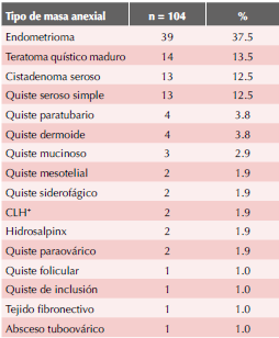 Estudio de serie de casos, retrolectivo, efectuado en el Instituto Nacional de Perinatología Isidro Espinosa de los Reyes, que es un centro terciario de atención, con un programa debidamente establecido de cirugía de mínima invasión ginecológica. Los datos se recabaron de los expedientes clínicos de pacientes atendidas entre los meses de enero de 2014 a septiembre de 2015. Se incluyeron todas las pacientes intervenidas mediante cirugía de mínima invasión con una masa anexial catalogada benigna.