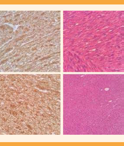 El estudio histopatológico reportó que se trataba de una proliferación fusocelular, debidamente delimitada, dispuesta en haces entrecruzados. Los núcleos eran alargados, monomorfos y de extremos romos. El estroma era escaso y colagénico. No se observaron atipias citonucleares ni necrosis. El estudio inmunohistoquímico de la lesión se hizo con actina de anticuerpos antimúsculo liso y desmina: ambos anticuerpos se reportaron positivos. Figura 4