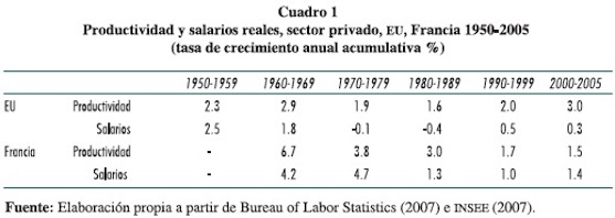 Además se ha desencadenado durante las últimas décadas una significativa congelación salarial. Francia y EU vuelven a ser buen ejemplo de ello, como se ve en el cuadro 1: los salarios han dejado de crecer en ambas economías al ritmo al que lo hace la productividad (como sucedía en los años cincuenta y sesenta).