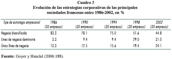 Como vemos en el cuadro 3, el tejido productivo francés se ha visto atravesado por una profunda reestructuración entre 1994 y 2002 con respecto a las estrategias empresariales de los diferentes grupos. Muchas grandes firmas francesas han reducido de manera sustancial su grado de diversificación en beneficio de una mayor focalización de su negocio. En 1986, 83% de las principales sociedades francesas del CAC 40 tenían una estrategia de negocio diversificada, mientras que en 1998 dicho porcentaje ya había descendido a 52%, y a 45% en 2002.