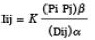 Where: Iij = Observed flows between cities i and j. (Pi Pj) = Product of the masses of cities i and j. (Dij) = Distance between cities i and j. K = Constant of proportionality derived from the propensity of people to interact. α and β = Parameters that weight the effect of the product of the masses by the measure of interaction and distance between them.