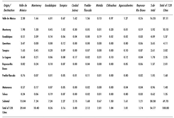 The gravitational weight of cities located in the central section of the country fell from 78.4% in 1966 to 67.8% in 1986, and to 48.3% by 2006, entailing a total decrease of 30.1% over these 50 years. This reduction is principally due to the fact that the MAVM became relatively less important as compared to the other 38 cities considered in the study in 1966, 8 such that its hierarchical weight dropped from 63.5% to 27.9%, and then to 25.6% in the same three years (if all cities are taken into account, the relative share of the MAVM falls even more). The cities located in the north of Mexico saw functional importance rise from 19.8% to 46.9%, that is, a gain of 27.2% over the four decades covered by these studies. In the southern portion of the country, the major cities grew modestly from 1.8% to 4.7%, in other words, a 2.9% increase in the same time period (see Table 4).