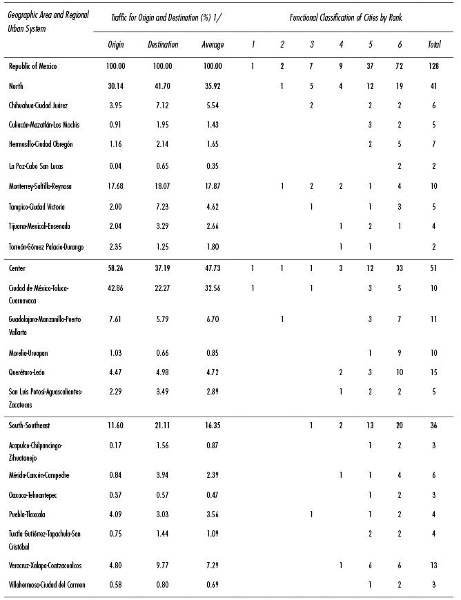 Rank 1 contained the Metropolitan Area of the Valley of Mexico (MAVM); Rank 2 included the metropolitan areas of Monterrey and Guadalajara; Rank 3 encompassed another seven cities; in Rank 4 were nine urban centers; in Rank 5, another 37; and in Rank 6, the remaining 72. A description of the hierarchy of the cities by rank and the principal information about them is found in Table 3.