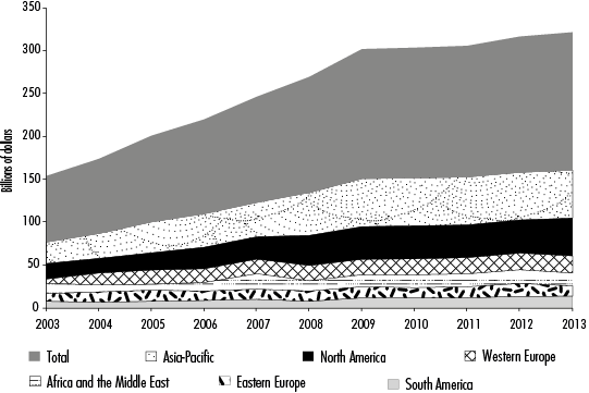 Based on these conditions, the following trends can be observed in the development of the TCSI after the crisis, which entail a social rationalization of the use of computational resources in conjunction with interconnection networks: a) cooperation among computers and the development of connectivity networks and Internet in integrating the interactions and operations of devices, as well as support for new services with a digital technology foundation, based on the development of Web 2.0, such as telemedicine, digital libraries, virtual laboratories, remote handling and monitoring of equipment, etc. Among these trends are some recent standout developments such as cloud computing, the virtualization of servers, social computing, remote and real-time process monitoring and control, etc.; b) on that basis, the full transition to Internet-protocol-based networks and a TCSI based on content transmission, within the process of digital conversion; c) the sharing of the costs of investing in active and passive infrastructure (electronic and physical-energy components, respectively), a process in which governments are expected to be the active agents of financing and deploy new telecommunications networks (ITU, 2009: 65), in the same way that telecommunications operators share networks (such as Vodafone and Telefónica in Europe) to reduce the costs of operation and maintenance); d) the shift of the dynamic axis of TCSI growth to emerging regions, which is expressed in the fact that foreign investment in the TCSI in emerging countries has surpassed that coming from developed countries, and has principally been in new mobile services (ITU, 2009: 67) (see Figure 1); and e) the renewed intensification of the international relocation and subcontracting of TCSI-based service activities, principally brought about by cloud computing, as it provides additional incentives related to a substantial reduction in the fixed costs of network investments for companies, as well as the outsourcing of services and remote service provision from locations with more competitive TCSIs (see Figure 1).