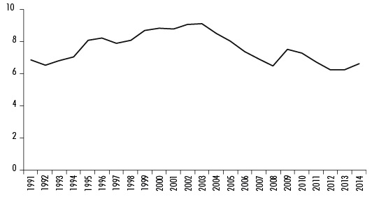 Figure 1 Open Unemployment Rate in Latin America (%), 1991-2014