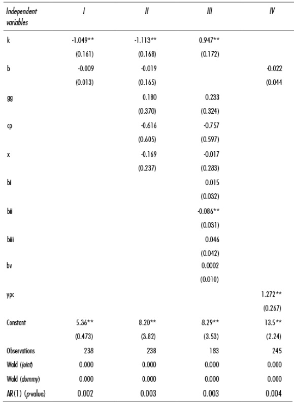 Finally, given the relevance of capital accumulation in explaining unemployment, as underscored in the post-Keynesian argument, investment responds principally to the evolution of effective demand. Namely, if investment varies as a function of effective demand, then (un)employment will do so, too. Column IV includes explanatory variables for the log of per capita income in real terms (ypc) and the compound labor market regulation index. In other words, for each percentage increase in income, the unemployment rate falls by the same measure. For its part, compound labor regulation continues to be irrelevant to unemployment.