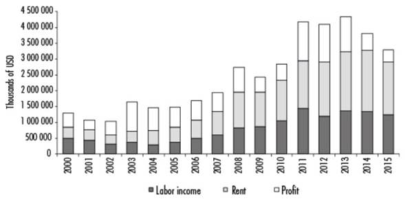 On the contrary, in 2005-2015, labor income recovered in both absolute and relative terms, while the surplus value fell relatively but rose significantly in absolute figures. Labor income recovered in the time period, going from 20% to a peak of 38% of VGA in 2015, while the figure in absolute values mushroomed from 381 million to 1.250 billion dollars. For its part, the surplus value fell in relative terms, oscillating between 73% (2005) and 62% of GVA (2015), but grew in absolute terms, from 1.093 to 2.040 billion dollars, reaching a maximum of 2.965 billion dollars in 2013.