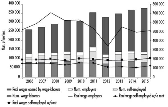 Second, 2003 ushered in an intense growth phase for the amount of value appropriated by the sector, changing the relative shares of remuneration sources. The commodities boom helped the relative share of labor income rise, expressed in a significant increase in the value of labor-power insofar as total labor income grew through the expansion of the real income of wage-laborers between 2006 and 2015 rather than through the number of people employed, which has remained relatively stable (see figure 2). When it comes to the other classes (self-employed and employers), it is remarkable that as a trend, the same number of employees and wage-laborers has been maintained, but unlike wage-laborers, real income for these other classes did not rise significantly, to the extent that between 2006 and 2015, real employer income fell 1.7%, while for the self-employed, it rose 9.6%, but if rent is removed from the equation, their real remuneration really fell 16.1%, becoming the class reporting the lowest income, which could explain the proletarization of the class, in the sense that between 2000 and 2011, family-type establishments (pursuant to the official definition) fell from 32,696 to 25,580 (Tommasino et al., 2014).
