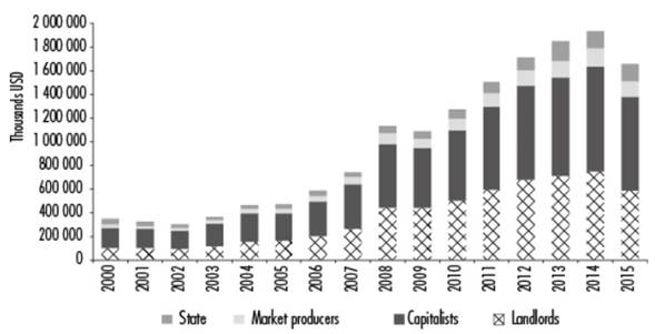 Two aspects in this process are worthy of attention. First, the distribution of ground-rent across the subjects competing for pieces of the agriculture and livestock GVA pie and, second, the ways in which the State appropriates agriculture and livestock surplus value. The landowners appropriate ground-rent through lease prices for those who lease their fields (landlords) and as part of profit for producers who are in turn also landowners (capitalists). At this level of analysis, the appropriation of rent by subject was determined. Between 2000 and 2015, ground-rent went from 349 million to 1.658 billion dollars, peaking at 1.939 billion in 2014. Its distribution (see Figure 4) points to the burgeoning share of landlords, going from 29% to 35.6% with a maximum of 40.2% in 2009, while the capitalists' share oscillated between 45% to 50%, and that of market producers hovered around 8%, and the share of the State first fell from 14.4% to 5% between 2000 and 2009, to later rise again to 8.6% in 2015. The numbers make it clear that rent distribution has stayed on a relatively stable track, with the main "adjustment variable" being the proportion of rent appropriated by the State by virtue of changes made to the tax policy.