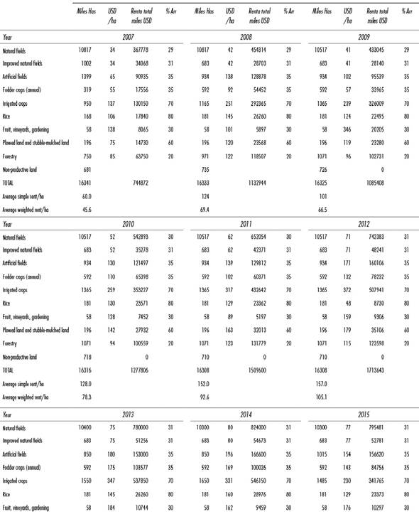 To calculate ground-rent per hectare, this study began with the leasing price data that the DIEA has been publishing since 2007 by processing the leasing data reported by the General Directorate of Records from the Ministry of Education and Culture, which accounts for practically 100% of formal lease agreements. The figures published set national leasing prices, and also show how prices vary by productive destination. Based on this breakdown by sector, ground-rent was reconstructed, weighted by the totality of the productive surface area with land-use numbers taken from the General Agriculture and Livestock Census (DIEA), the surveys by sector administered by the DIEA, and sworn statements made to the Livestock Control Directorate (DICOSE). This adjustment is important because the national average conceals the problem that the magnitudes of surface area leased annually by sector are not equivalent to the total land used in productive surface area, in the sense that there are some sectors, like agriculture, where 70% of the surface area is under lease, but in livestock, the figure falls to 30%. Appendix 1 introduces the details of the surface area occupied, lease prices, total rent, and percentage leased by land-use type.
