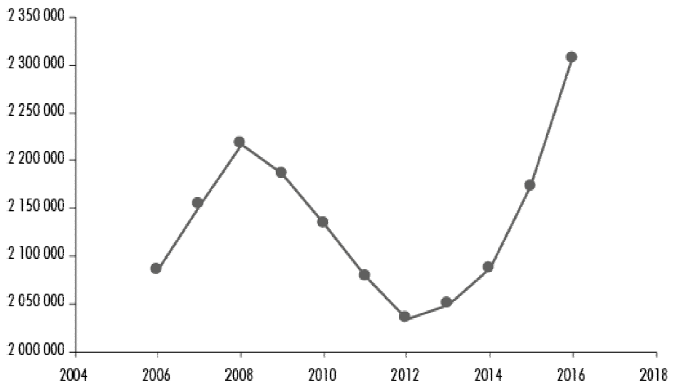 Figure 1 Number of Foreigners in Japan, 2006-2016