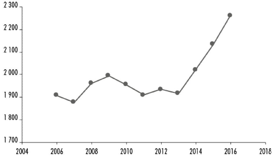 According to data published by the Japanese Ministry of Justice, the number of residents of Mexican origin has been on the rise since 2014, reaching 2,262 people in 2016. These figures did not include diplomats or Mexicans with short-stay status. Only medium- and long-stay status Mexicans are counted in this number (see Figure 2).