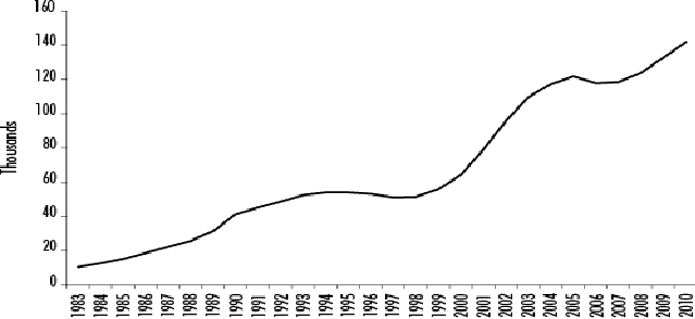 Source: Created by the author using Graph 2 of Trends in Number of International Students by Institutional Type. Japan Student Service Organization, Result of an Annual Survey of International Students in Japan, 2015. Starting in 2011, pursuant to the visa unification process, the total number of students began to include Japanese language institutes.