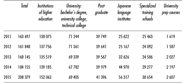 Source: Created by the author based on information from the Japan Student Service Organization, Result of an Annual Survey of International Students in Japan, 2015.