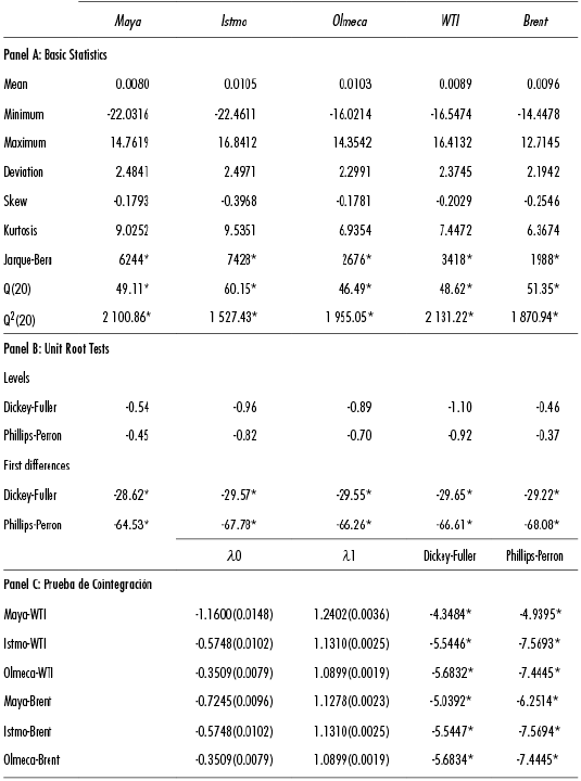 For purposes of this analysis, both price series were transformed into continuous yield series as follows: Rt= In(Pt)-In(Pt-1). Table 1 summarizes the basic statistics on yields and outcomes of the unit root, autocorrelation, and cointegration tests. As shown in Panel A, all of the mean values are positive, but small, with respect to the standard deviations, which amounted to between 2.19% and 2.49%. This indicates a positive yield-risk relationship and greater exposure to risk for the participants in the oil market, in particular for the Istmo and Maya crudes. Likewise, all of the yield series showed negative skewness and excess kurtosis, which prompts a rejection of the assumption of normality due to the presence of outlier observations and the high value of the Jarque-Bera statistic.