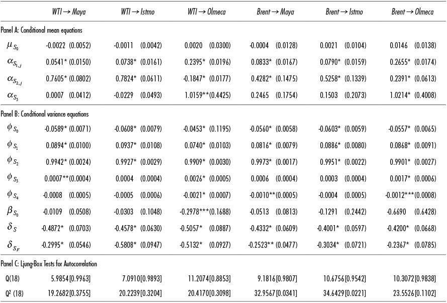 parameters only indicates volatility propagation effects in the WTI→Maya, WTI→Olmeca, and Brent→Olmeca relationships at 1 and 5%, with strong positive impacts running from WTI and Brent to Olmeca. This result shows that the Maya and Olmeca oil markets are evidently vulnerable, not only due to news in the own market, but also due to unexpected shocks in the international oil futures markets. This finding can be attributed to the mechanism adopted by the governmental authorities to set regulated Mexican oil prices, because Mexico as a producer of oil is a taker of prices by nature rather than the position of setter.