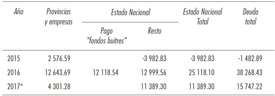 Durante el 2016, el gobierno nacional tomó deuda externa por 25.118 millones de dólares, de los cuales 12.119 millones de dólares fueron directamente destinados al pago de la sentencia a favor de los holdouts. En tanto, las provincias y el sector privado emitieron deuda por 12.643 millones de dólares. Este proceso continuó y en los primeros tres meses de 2017 se emitió un total de 15.747 millones de dólares.