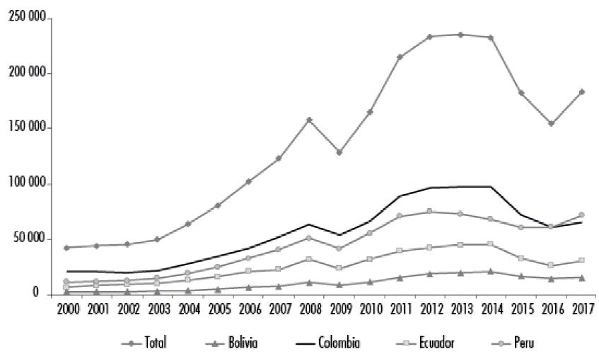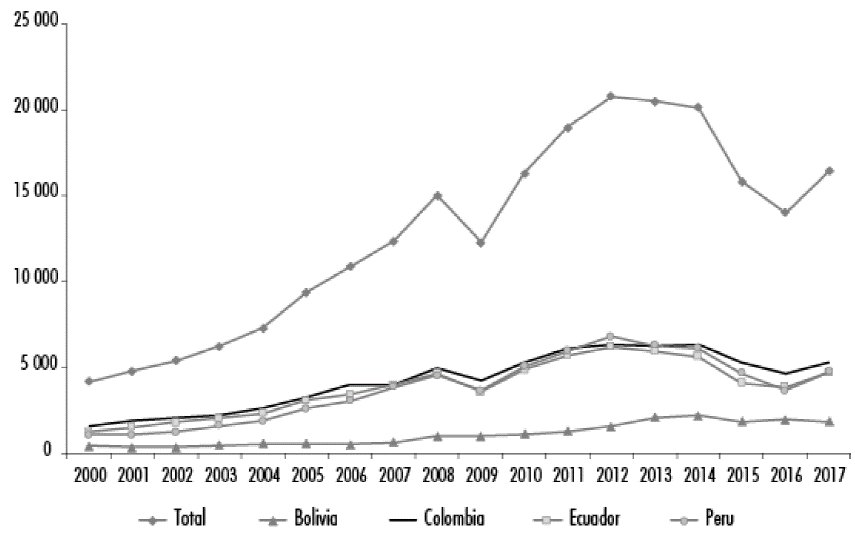 Figure 1 shows trade flow9 of the CAN and its members for the period of 2000-2017. During this period, intra-bloc trade in the CAN had an average of$230.750 billion USD. Meanwhile, Colombia, Ecuador and Peru have had a similar trade flow. Bolivia is the country with the lowest intra-bloc trade, accounting for only 8% of the total.