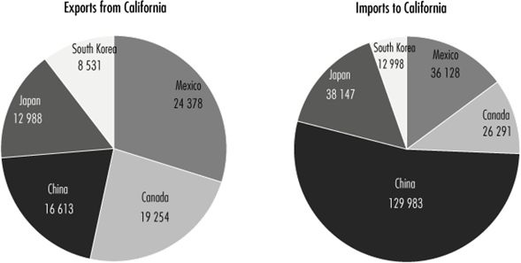Regarding the state of CA, it has the smallest stretch of international border between the two countries; it is the second largest trading partner of MX and vice versa. Figure 3 shows the gross value of CA exports and imports by country (top five countries) in 2013.