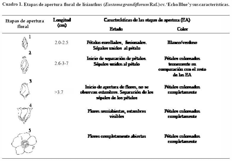 En marzo del 2002 se cosecharon tallos de lisianthus (Eustoma grandiflorum Raf.) cv. 'Echo Blue' con flores dobles (corolas con dos hileras de pétalos) y 60 cm de altura en un invernadero de la empresa DAYSA S. A. en Cuernavaca, Morelos. El corte se realizó 5 cm arriba del nivel del suelo con la flor principal abierta dejando un total de cinco botones por tallo (se eliminaron los botones jóvenes menores de 2 cm). Los tallos se colocaron en agua destilada para su traslado al laboratorio de Fisiología Postcosecha del Colegio de Postgraduados en Montecillo, México, donde se seleccionaron los libres de daños y defectos y se eliminaron los tres primeros pares de hojas de la base.