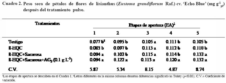 En cuanto al peso seco se observó mayor acumulación (p<0.05) en los tratamientos con sacarosa respecto al testigo. En la EA 1 el incremento fue de 22%; en la EA 2, de 7.3 a 28.5%; en la EA 4, del 2 al 8%; mientras que para la EA 5 la acumulación de peso seco fue 25.7% mayor, coincidiendo con la mayor acumulación de azúcares, lo que contribuyó a prolongar la vida de florero de estos tratamientos (Cuadro 2).